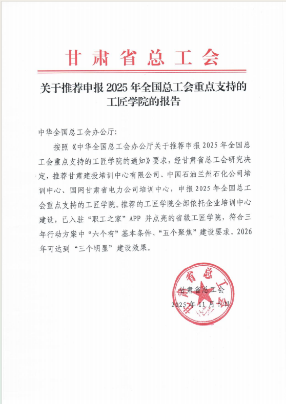 近日,從中華全國總工會傳來喜訊,甘肅建投培訓中心有限公司憑借扎實的基礎建設與顯著的育人成效,成功獲批為“2025年全國總工會重點支持的工匠學院”。據(jù)悉,此次評選中,甘肅省僅有三家單位獲此殊榮。