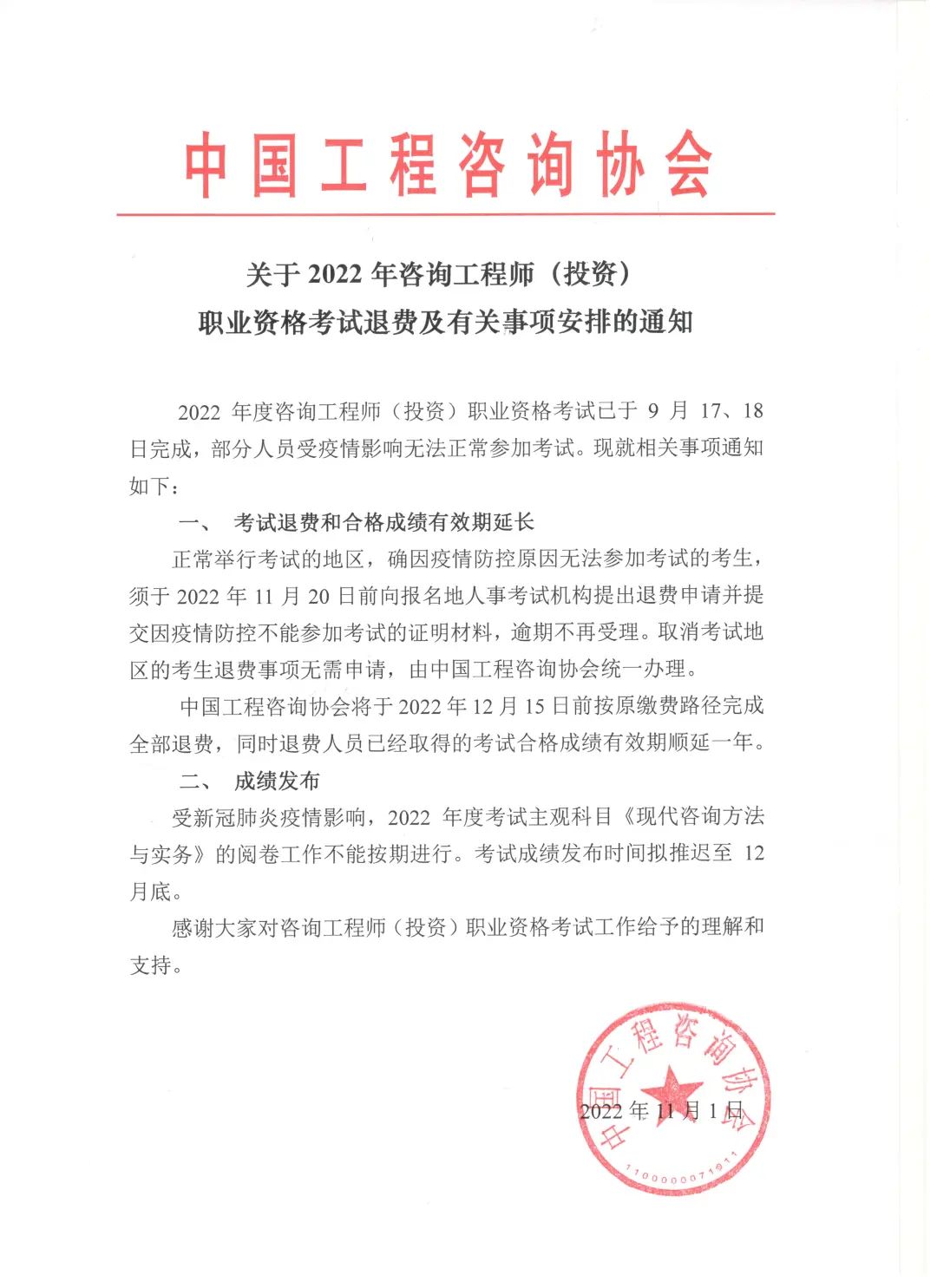 中國(guó)工程咨詢協(xié)會(huì)關(guān)于2022年咨詢工程師(投資)職業(yè)資格考試退費(fèi)及有關(guān)事項(xiàng)安排的通知