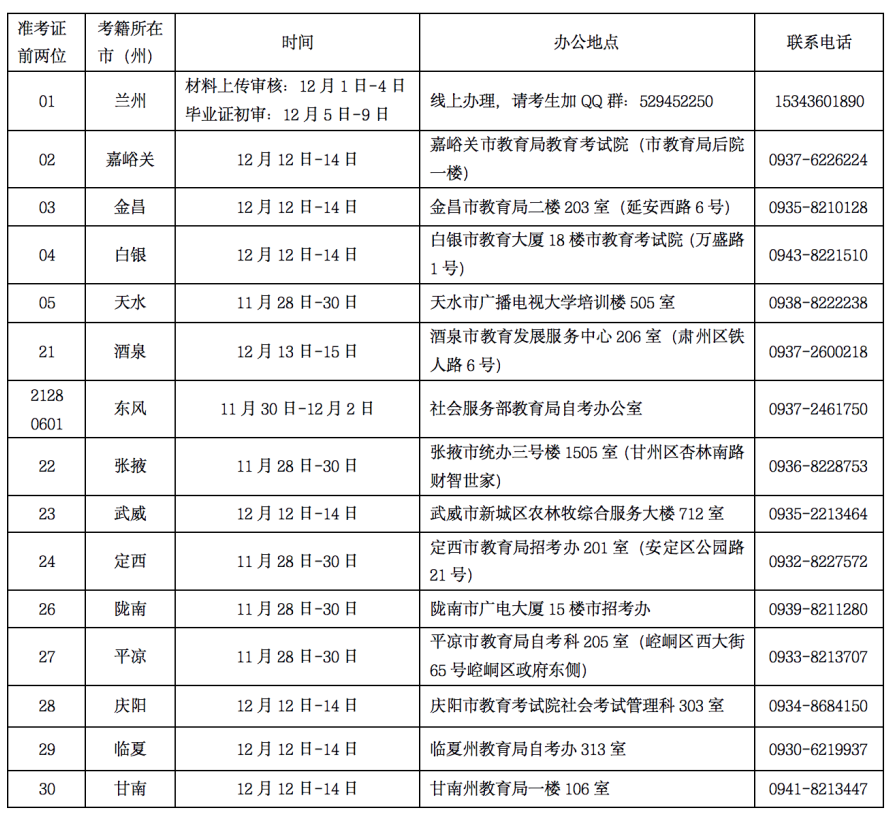 附:2022年下半年甘肅省高等教育自學(xué)考試社會(huì)型考生各市州畢業(yè)初審時(shí)間及聯(lián)系方式