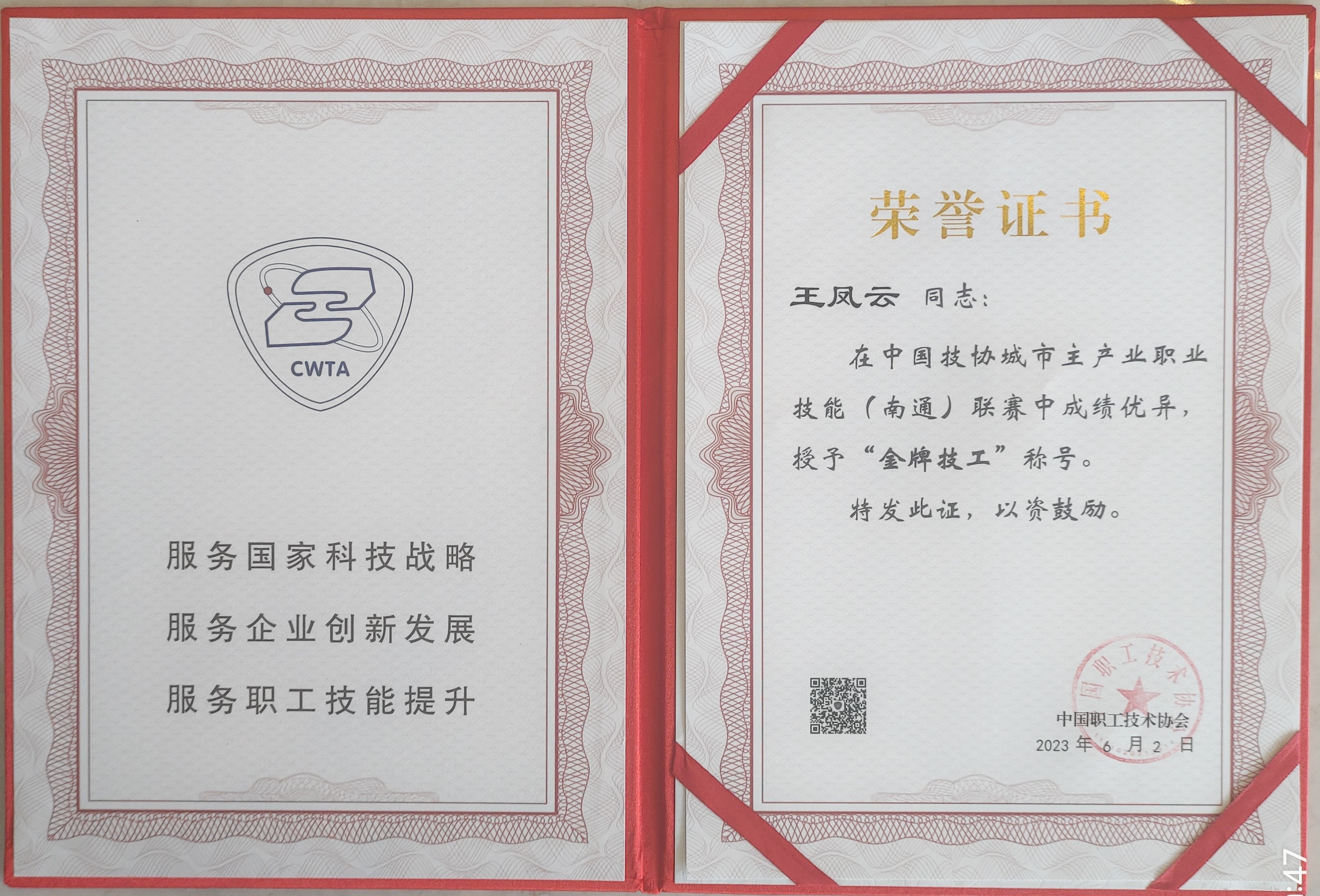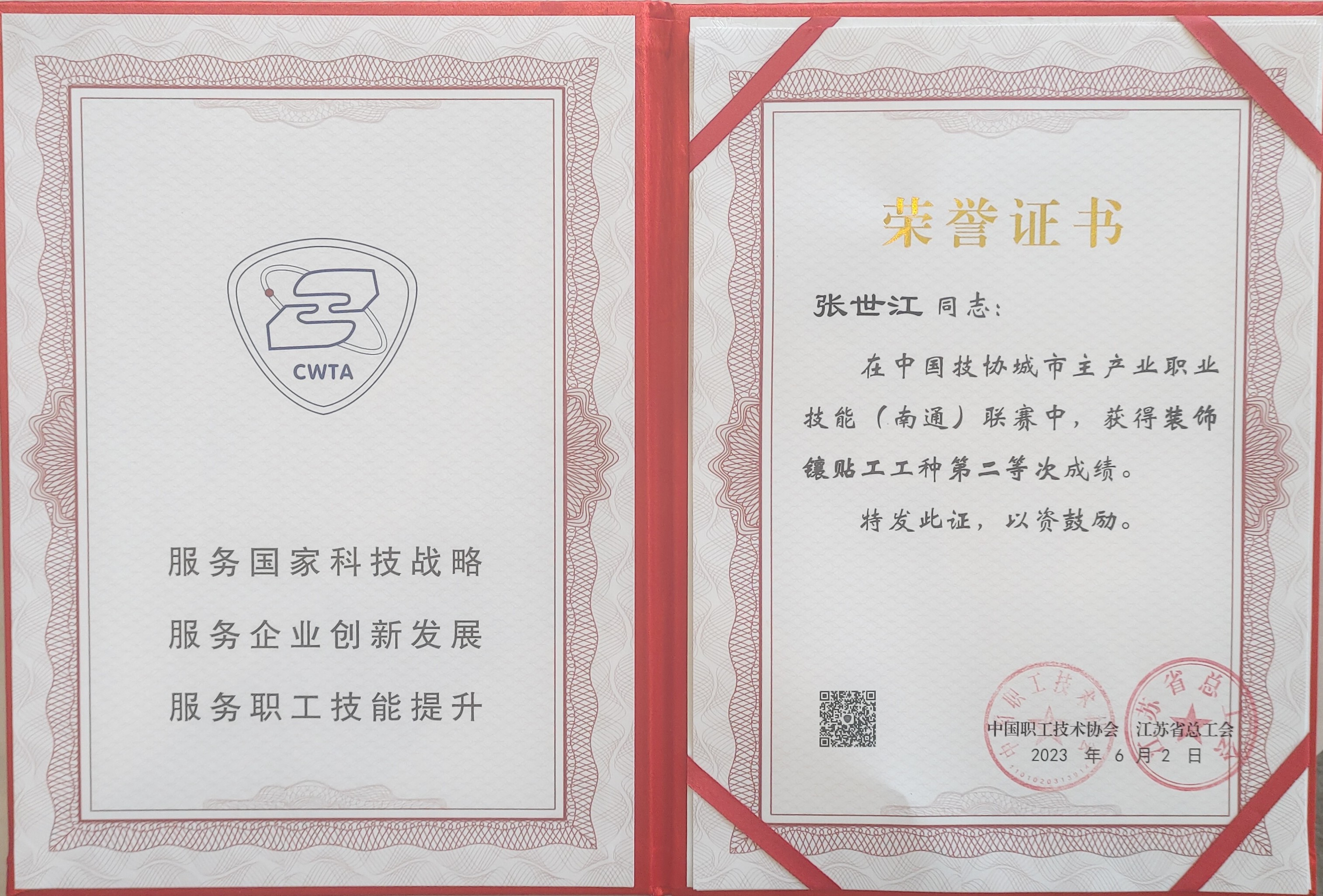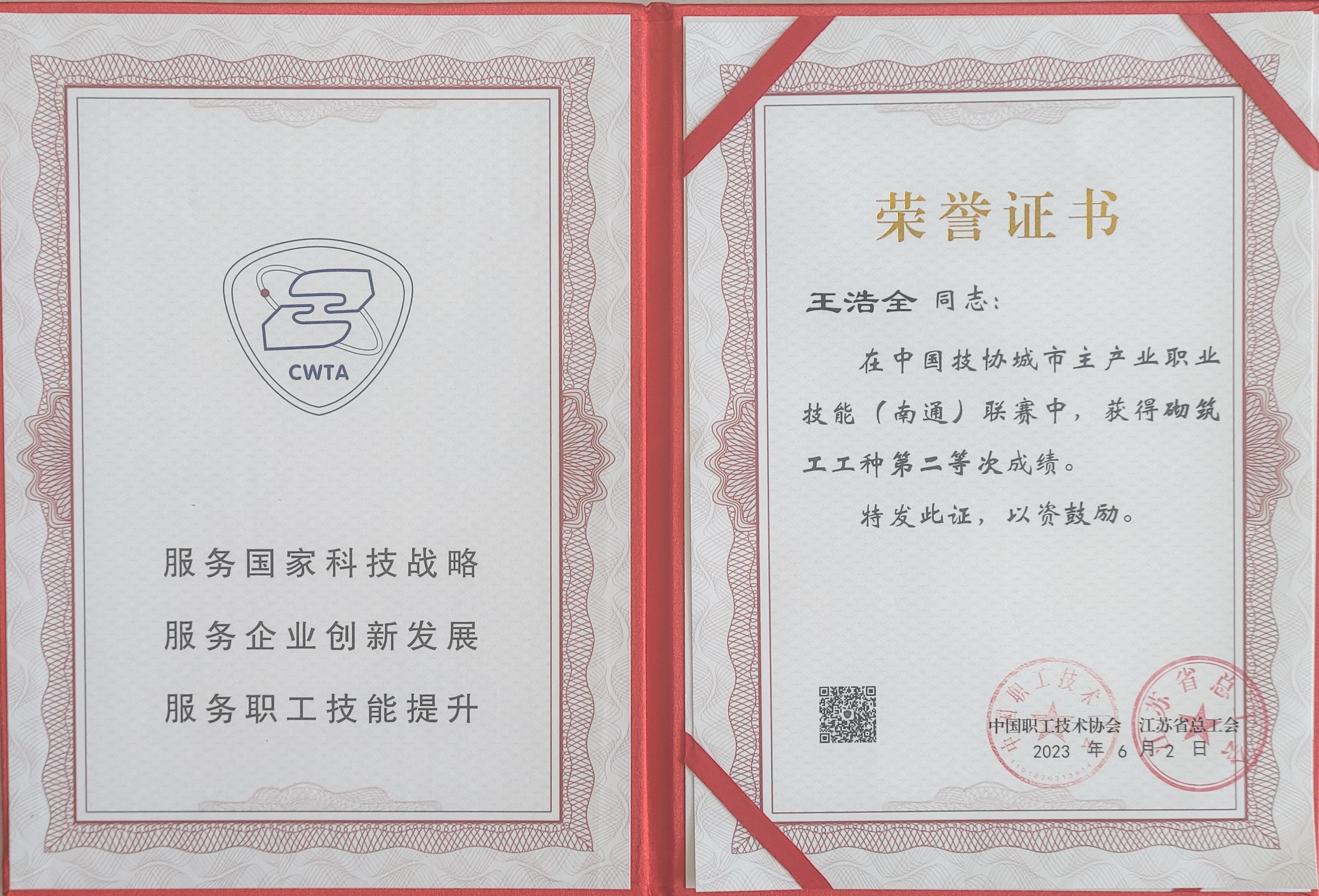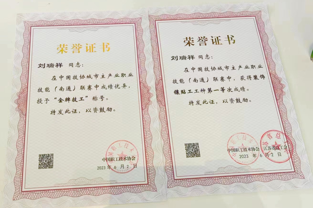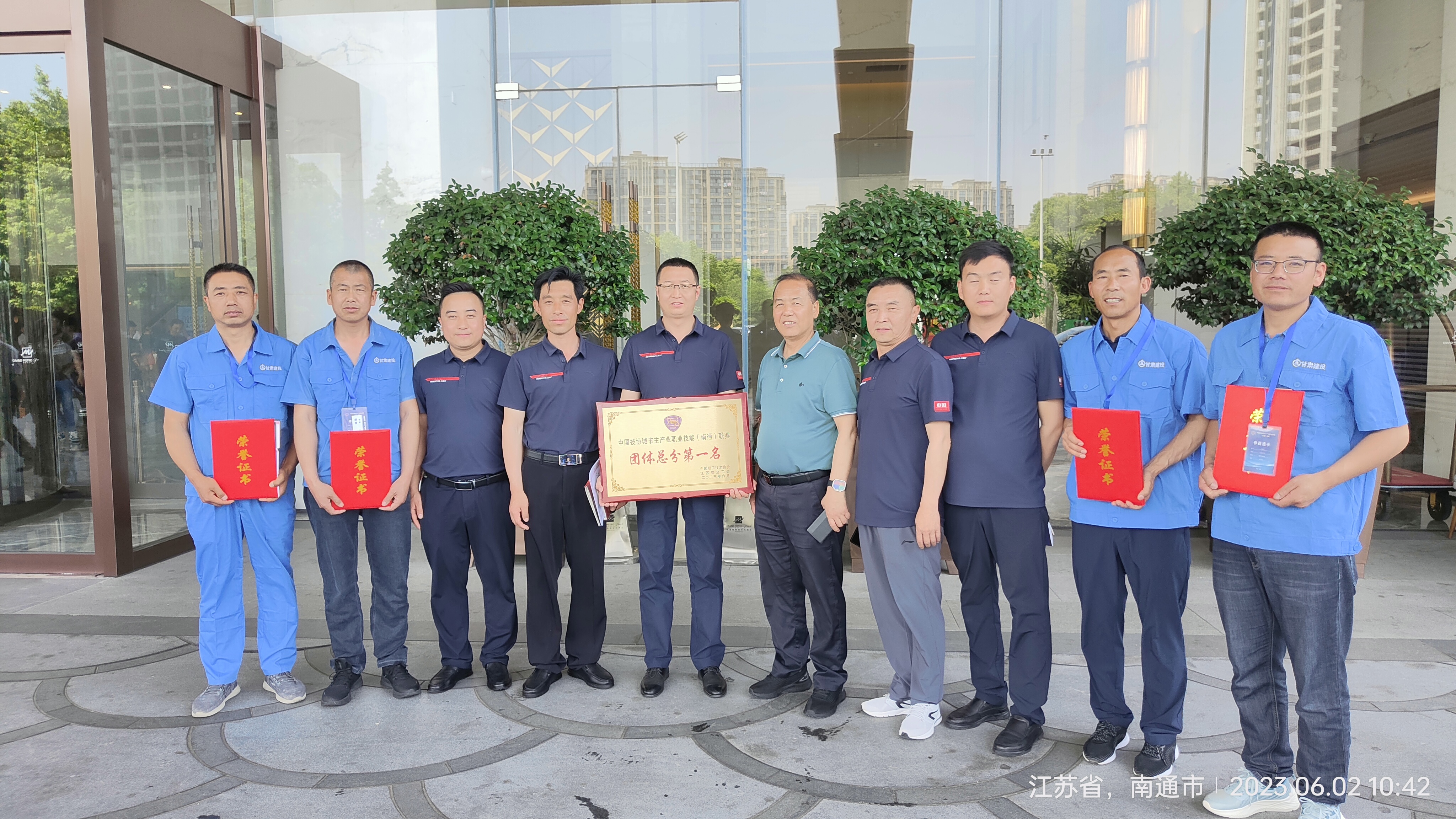6月2日,參加中國(guó)技協(xié)城市主產(chǎn)業(yè)職業(yè)技能(南通)聯(lián)賽的甘肅建投代表隊(duì)獲得集體獎(jiǎng)項(xiàng)團(tuán)體總分第一名,甘肅建投代表隊(duì)砌筑工選手王鳳云(右2)獲得一等獎(jiǎng)(第4名)、鑲貼工選手劉瑞祥(左2)獲得一等獎(jiǎng)(第5名),均獲得金牌技工稱號(hào);砌筑工選手王浩全(右1)獲得二等獎(jiǎng)、鑲貼工選手張世江(左1)獲得二等獎(jiǎng),均獲得銀牌技工稱號(hào)。